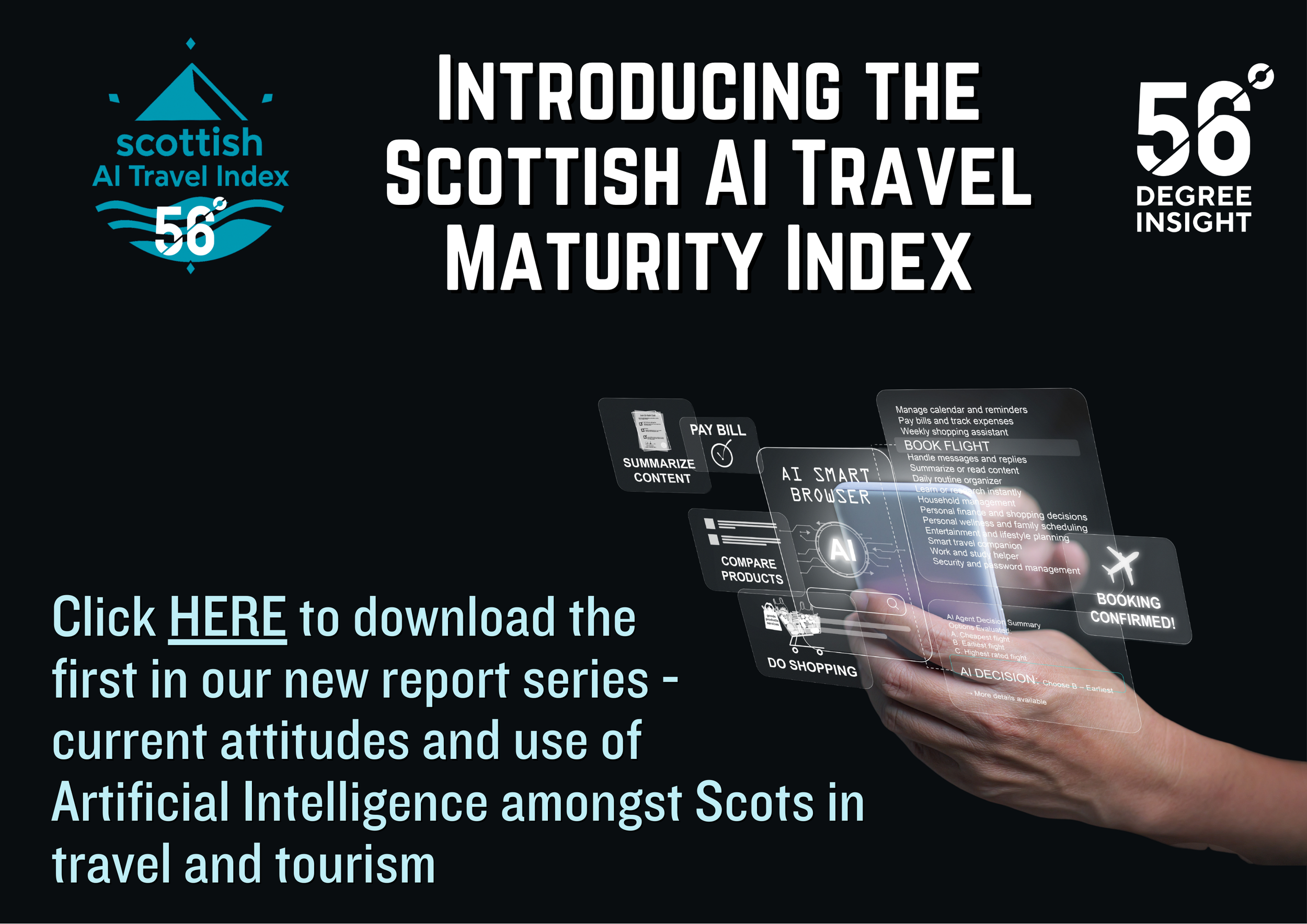 Therefore, the team at 56 Degree Insight are delighted to launch a twice yearly tracker of AI use amongst Scots - focusing on its use in travel and tourism planning and decision-making. We undertook a baseline survey in late January 2026 amongst 1,005 Scots adults. These findings will act as a benchmark against which we will measure trends every six months. The key results examine AI awareness and use in everyday life as well as how AI is currently being used in travel and tourism decision-making and how consumers expect this to develop in the coming months and years. We have segmented the population into AI Travel segments and created our AI Travel Maturity Index - a key metric that we will monitor every six months. To access the full report, just click on the link below.....